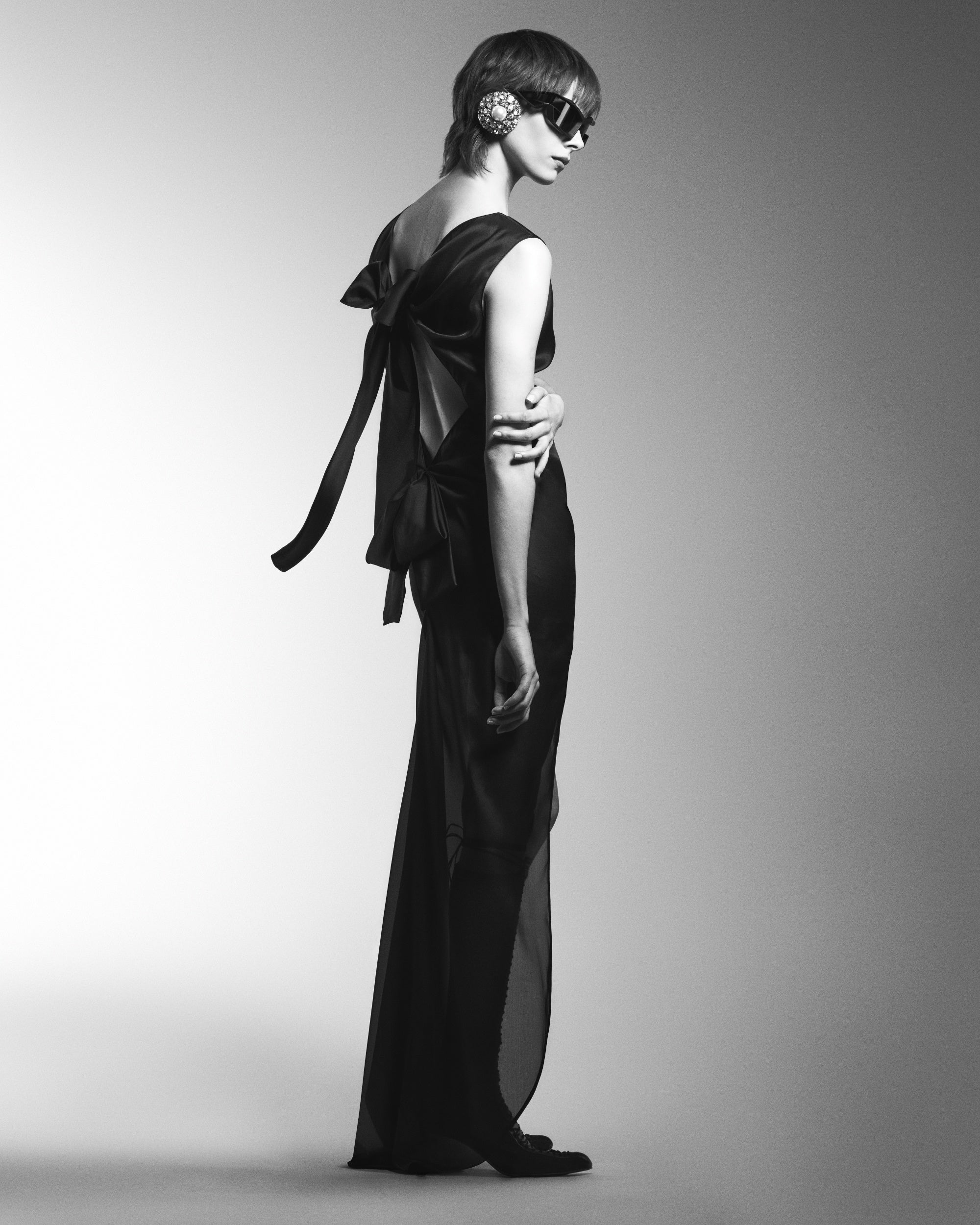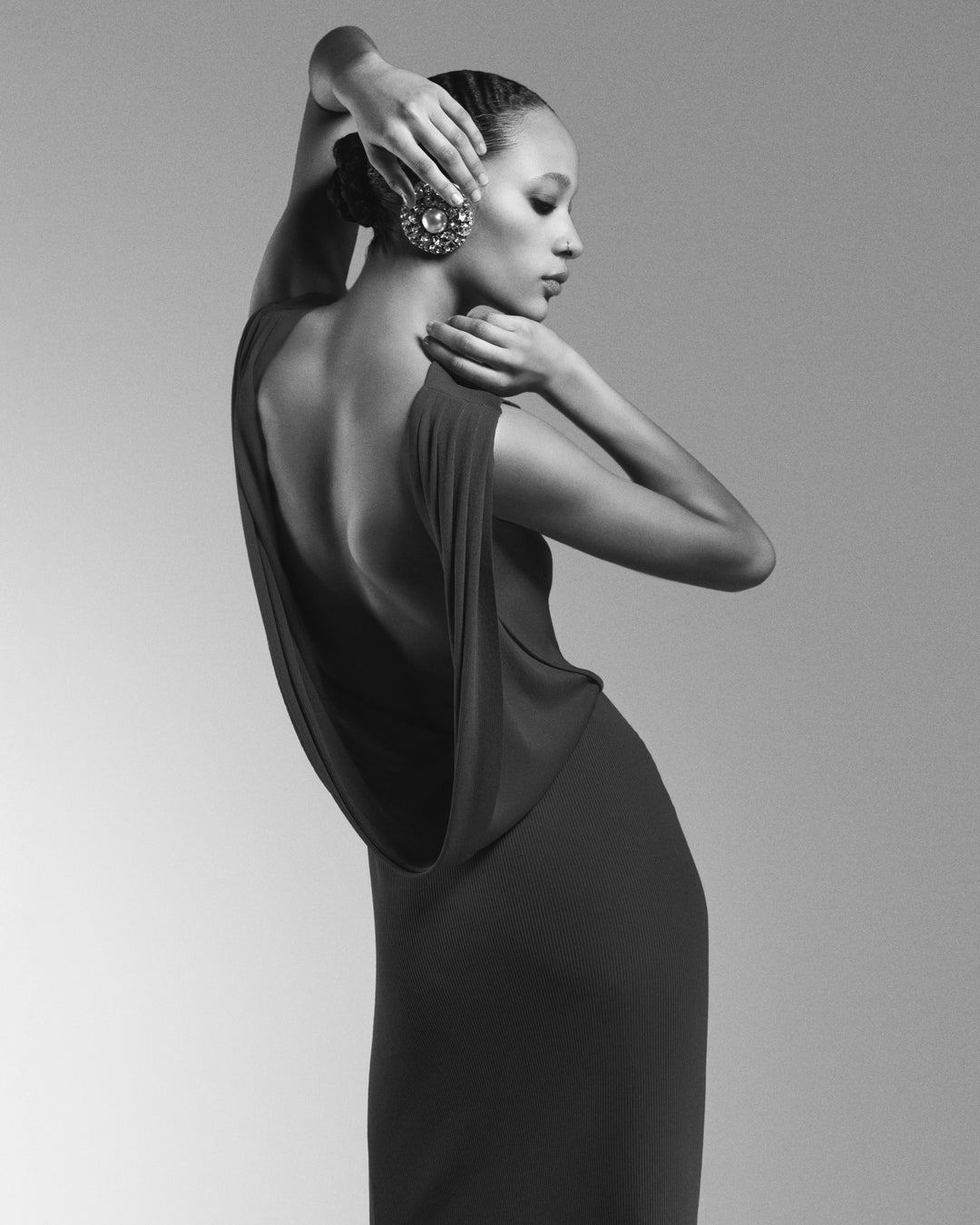 メゾンのキャンペーンに初めて登場するセレーナ・フォレストのビジュアルは、後ろから撮影されたモノクロのポートレートで、ドレープのディテールと背中のカッティングが特徴のロングドレスを着用してクールな姿で写っています。