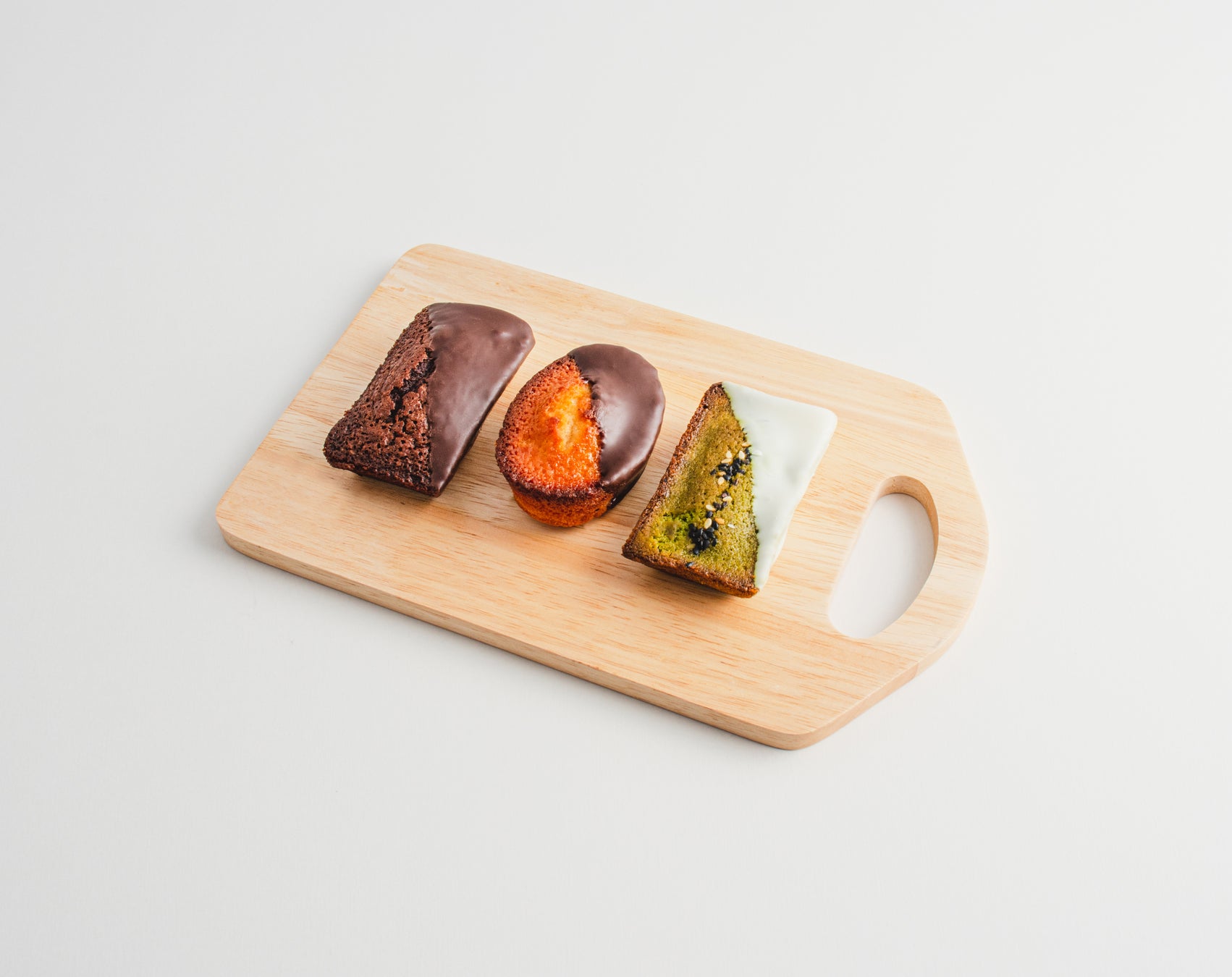フィナンシェ、フィナンシェショコラ、フィナンシェ・テ・ヴェール(抹茶)それぞれにコーティングを施した、全3種が入ったアソートBOX。