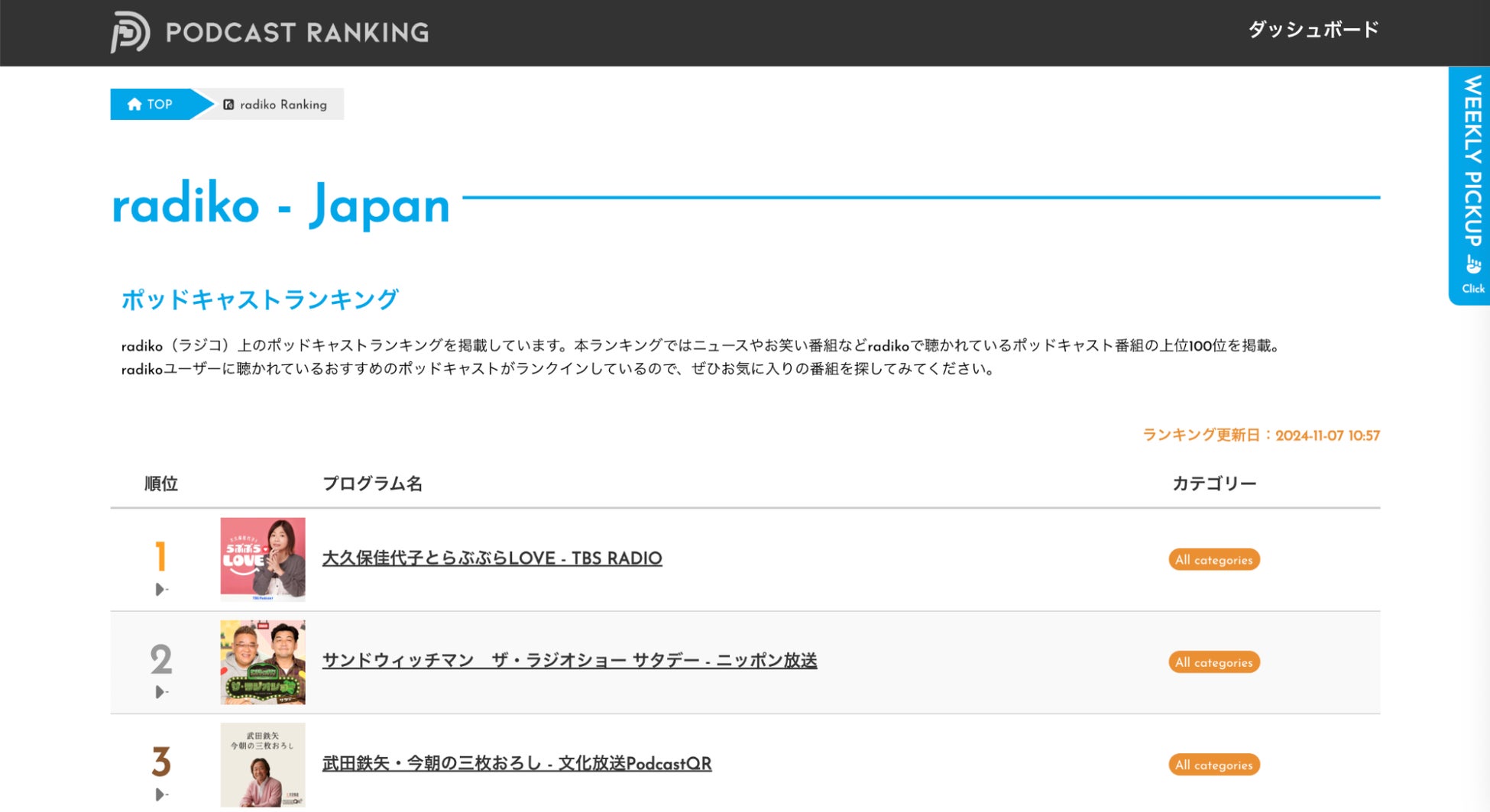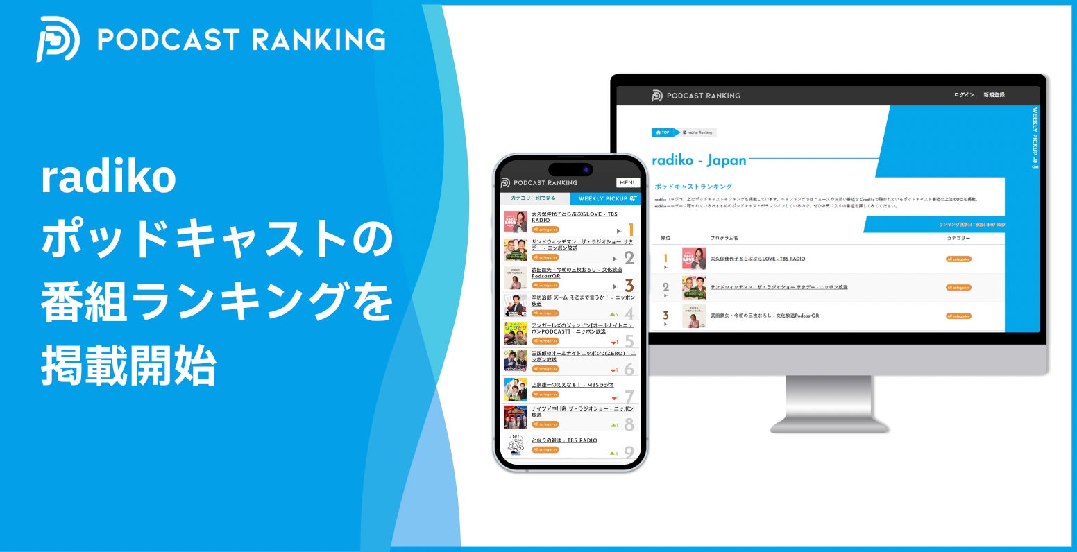 今回、株式会社radikoとの連携による機能追加により、国内最大規模のラジオ配信プラットフォーム「ラジコ」のポッドキャストランキングが掲載されました。