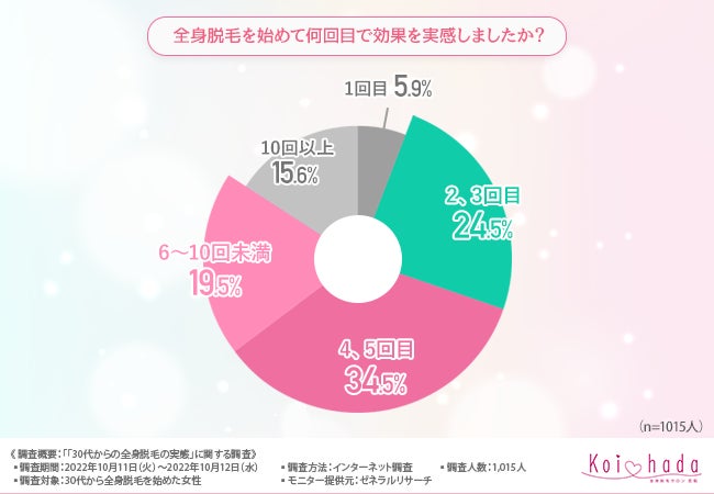 「全身脱毛を始めて何回目で効果を実感しましたか?」と質問したところ、『1回目(5.9%)』『2、3回目(24.5%)』『4、5回目(34.5%)』『6~10回未満(19.5%)』『10回以上(15.6%)』という回答結果になりました。