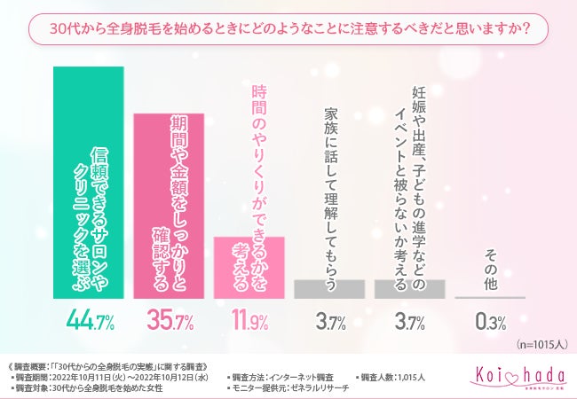 「30代から全身脱毛を始めるときにどのようなことに注意するべきだと思いますか?」と質問したところ、『信頼できるサロンやクリニックを選ぶ(44.7%)』と回答した方が最も多く、次いで『期間や金額をしっかりと確認する(35.7%)』『時間のやりくりができるかを考える(11.9%)』『家族に話して理解してもらう(3.7%)』『妊娠や出産、子どもの進学などのイベントと被らないか考える(3.7%)』と続きました。