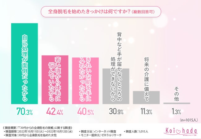 「全身脱毛を始めたきっかけは何ですか?(複数回答可)」と質問したところ、『自己処理が面倒だったから(70.3%)』と回答した方が最も多く、次いで『若い頃から体毛に悩んでいたから(42.4%)』『きれいな肌を手に入れたかったから(40.5%)』『背中など手が届かないところの処理ができないから(30.9%)』『将来の介護に備えて(11.3%)』と続きました。