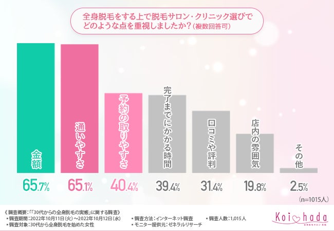 「全身脱毛をする上で脱毛サロン・クリニック選びでどのような点を重視しましたか?(複数回答可)」と質問したところ、『金額(65.7%)』と回答した方が最も多く、次いで『通いやすさ(65.1%)』『予約の取りやすさ(40.4%)』『完了までにかかる時間(39.4%)』『口コミや評判(31.4%)』『店内の雰囲気(19.8%)』と続きました。