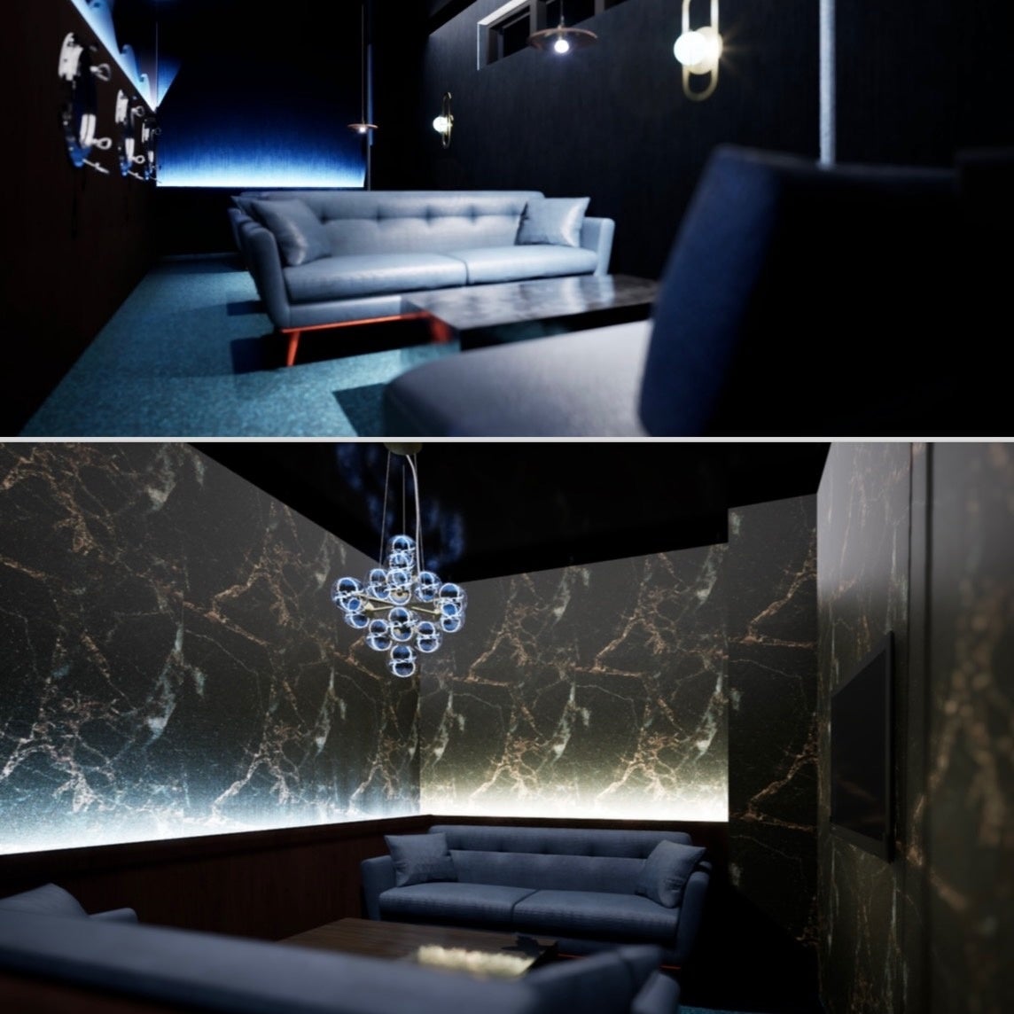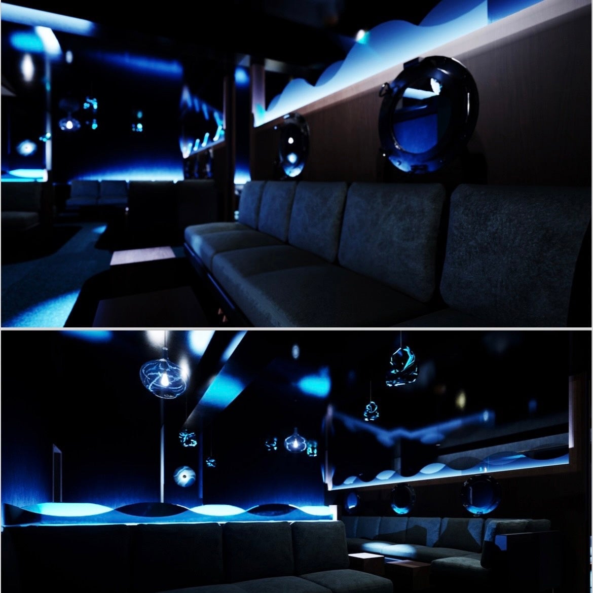 C.STAND 那覇松山店の店内は、暗めの照明と美しい内装がポイント。まるでバーのような大人っぽい雰囲気で、リラックスしながらお酒やシーシャを楽しめる空間です。洗練されたインテリアと最新の設備により、非日常の特別な体験をお届けします。