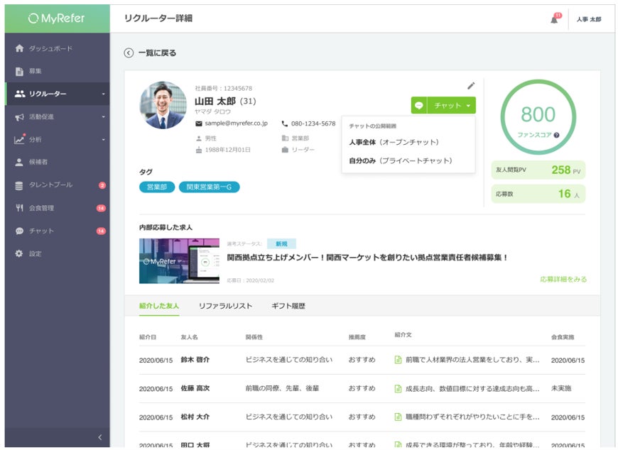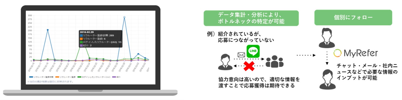 従業員が知人・友人を紹介して選考する「リファラル採用」。「MyRefer」は、企業のリファラル採用を促進するクラウドサービスです。企業と従業員、将来の採用候補者をつなげ、つながりから本来巡り合えなかったマッチ率の高い採用と企業エンゲージメントの向上を支援します。