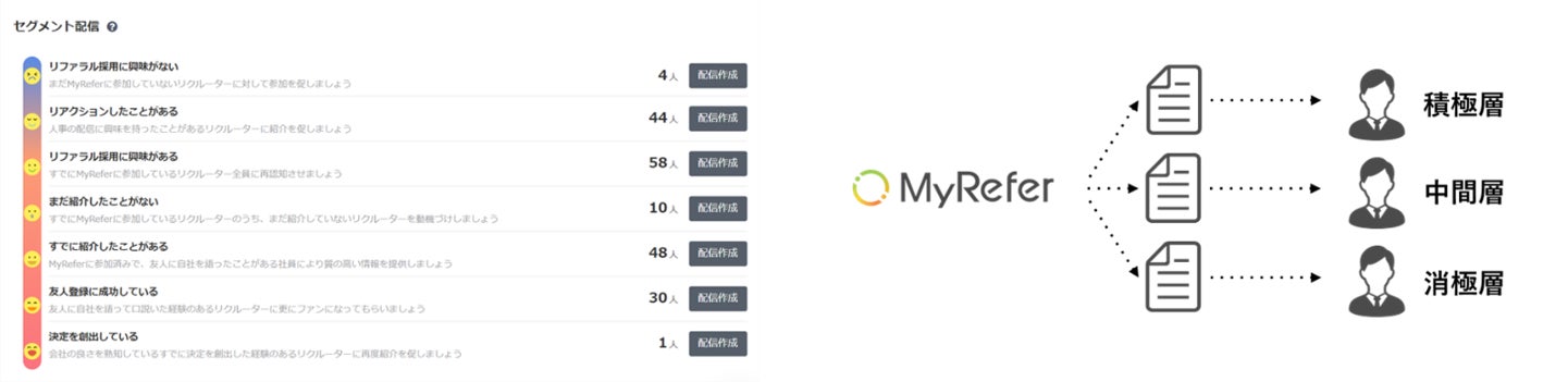 社内ニュースや求人情報の閲覧数や紹介数などからリファラル採用に対する協力意向を計測し、積極的な社員・中立的な社員・消極的な社員が自動でセグメントされます。また、社員の興味度合いに応じて配信する内容をカスタマイズすることができ、それぞれに合ったコミュニケーションを図ることができます。