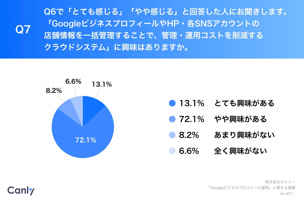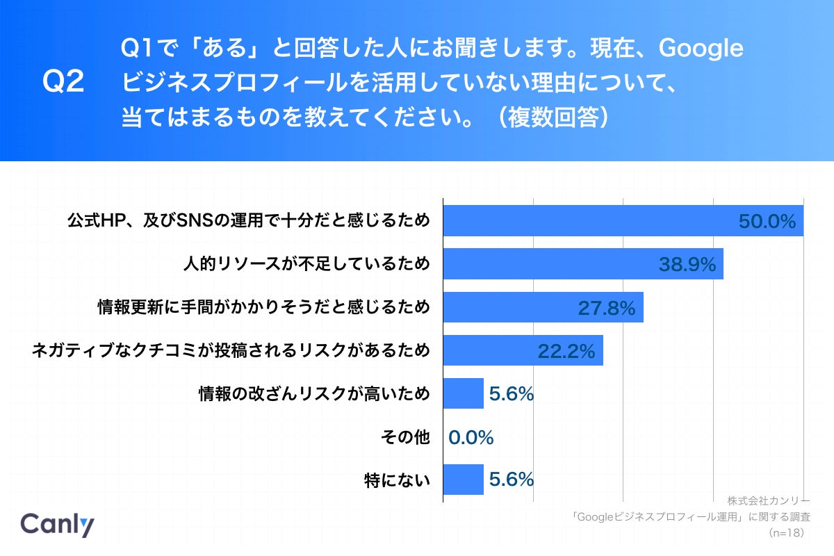 Googleビジネスプロフィール・HP・各SNSの一括管理サービス「Canly(カンリー)」の開発・提供を行う株式会社カンリー(所在地:東京都渋谷区、代表取締役:辰巳 衛・秋山 祐太朗)は、Googleビジネスプロフィールを活用していない店舗事業(5店舗以上)の経営者・役員・マーケティング担当者100名に対し、「Googleビジネスプロフィール運用」に関する調査を実施いたしましたので、お知らせいたします。