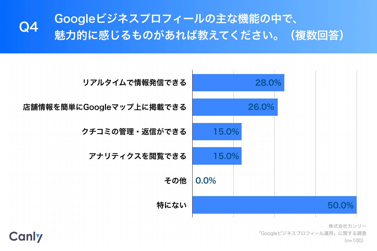 次に、Googleビジネスプロフィールの主な機能の中で魅力的に感じる点について伺ったところ、「リアルタイムで情報発信できる」が28.0%、「店舗情報を簡単にGoogleマップ上に掲載できる」が26.0%の結果となりました。