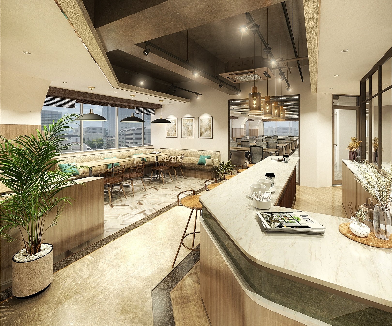 奥行きのあるEVホールから導線の流れに合わせて床と天井のラインが奥の空間へと繋がり、中央ラウンジではバーカウンターを中心にソファスペース、ファミレスブーススペースが広がるなど、多様な過ごし方が可能なニーズに応えられる空間構成となっています。