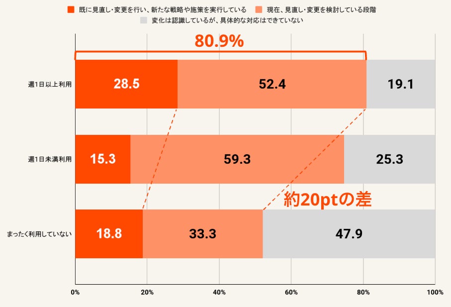 <顧客の変化に合わせた戦略や施策の見直し・変更を行っているか(生成AI利用頻度別)>