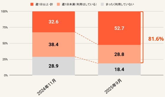 生成AIを業務に利用している人は、回答者全体の81.6%に達しました 。特に「週1日以上利用している」層は52.7%となり、前回調査の32.6%から大きく増加しました 。一方で「まったく利用していない」層は18.4%に減少(前回調査では28.9%)し、生成AIの業務活用が本格化している様子がうかがえます 。