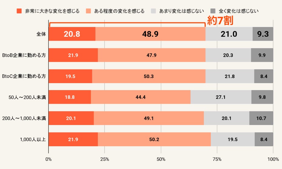 「生成AIの普及で顧客の購買行動に変化を感じるか」という質問に対し、約7割(69.8%)のマーケターが「変化を感じる」と回答しました 。