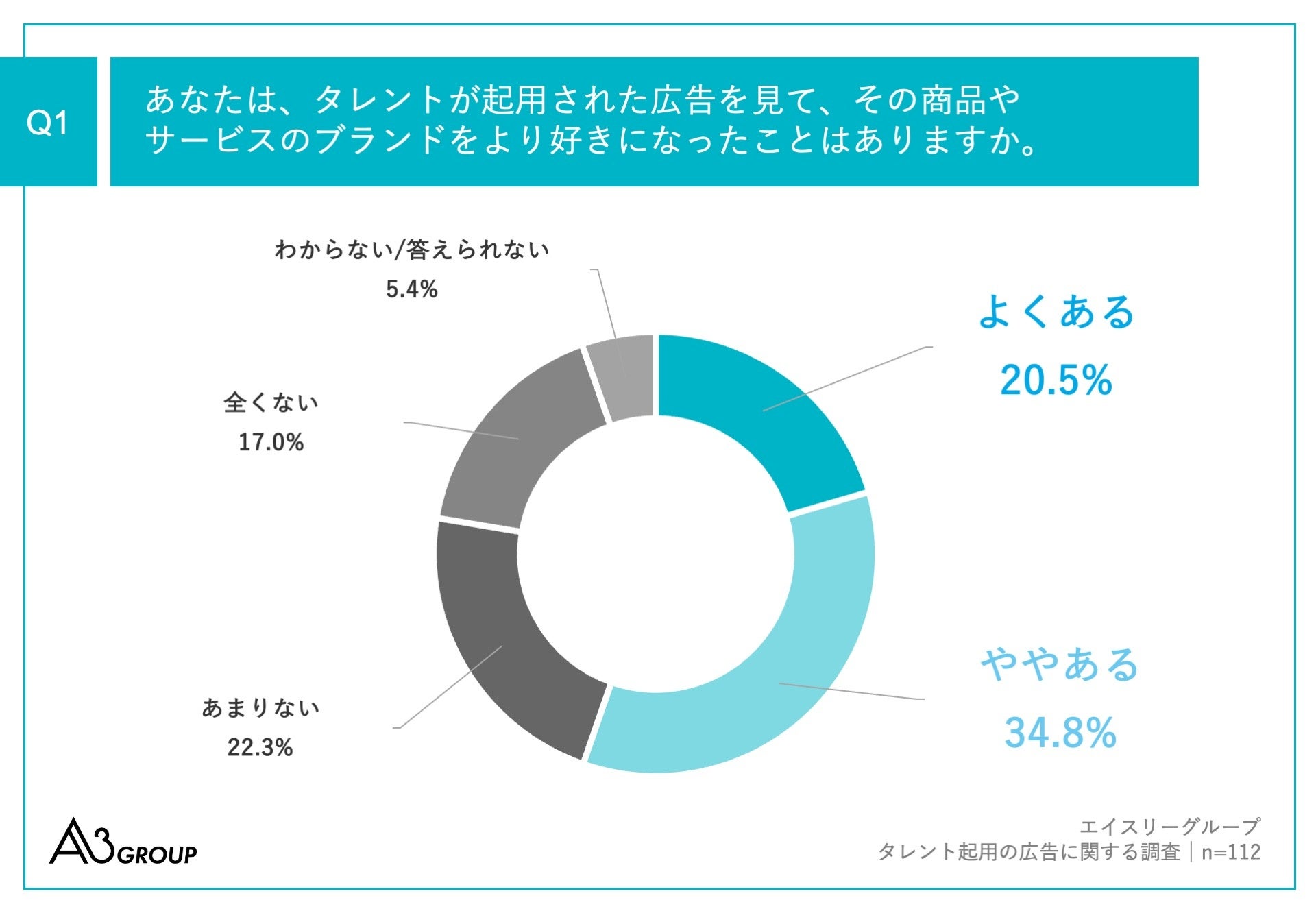 「Q1.あなたは、タレントが起用された広告を見て、その商品やサービスのブランドをより好きになったことはありますか。」(n=112)と質問したところ、「よくある」が20.5%、「ややある」が34.8%という回答となりました。