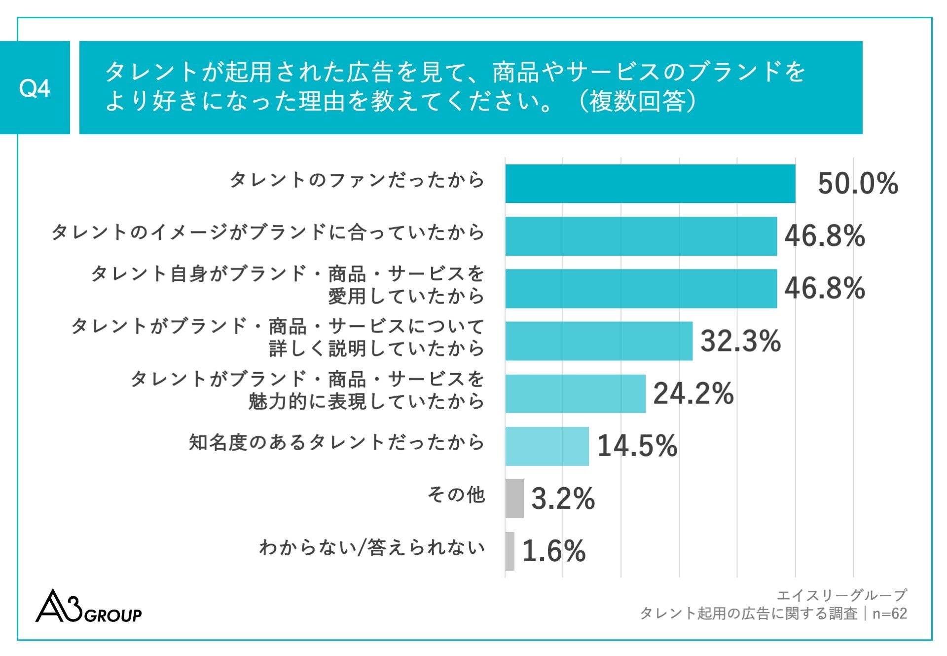 Q1で「よくある」「ややある」と回答した方に、「Q4.タレントが起用された広告を見て、商品やサービスのブランドをより好きになった理由を教えてください。(複数回答)」(n=62)と質問したところ、「タレントのファンだったから」が50.0%、「タレントのイメージがブランドに合っていたから」が46.8%、「タレント自身がブランド・商品・サービスを愛用していたから」が46.8%という回答となりました。