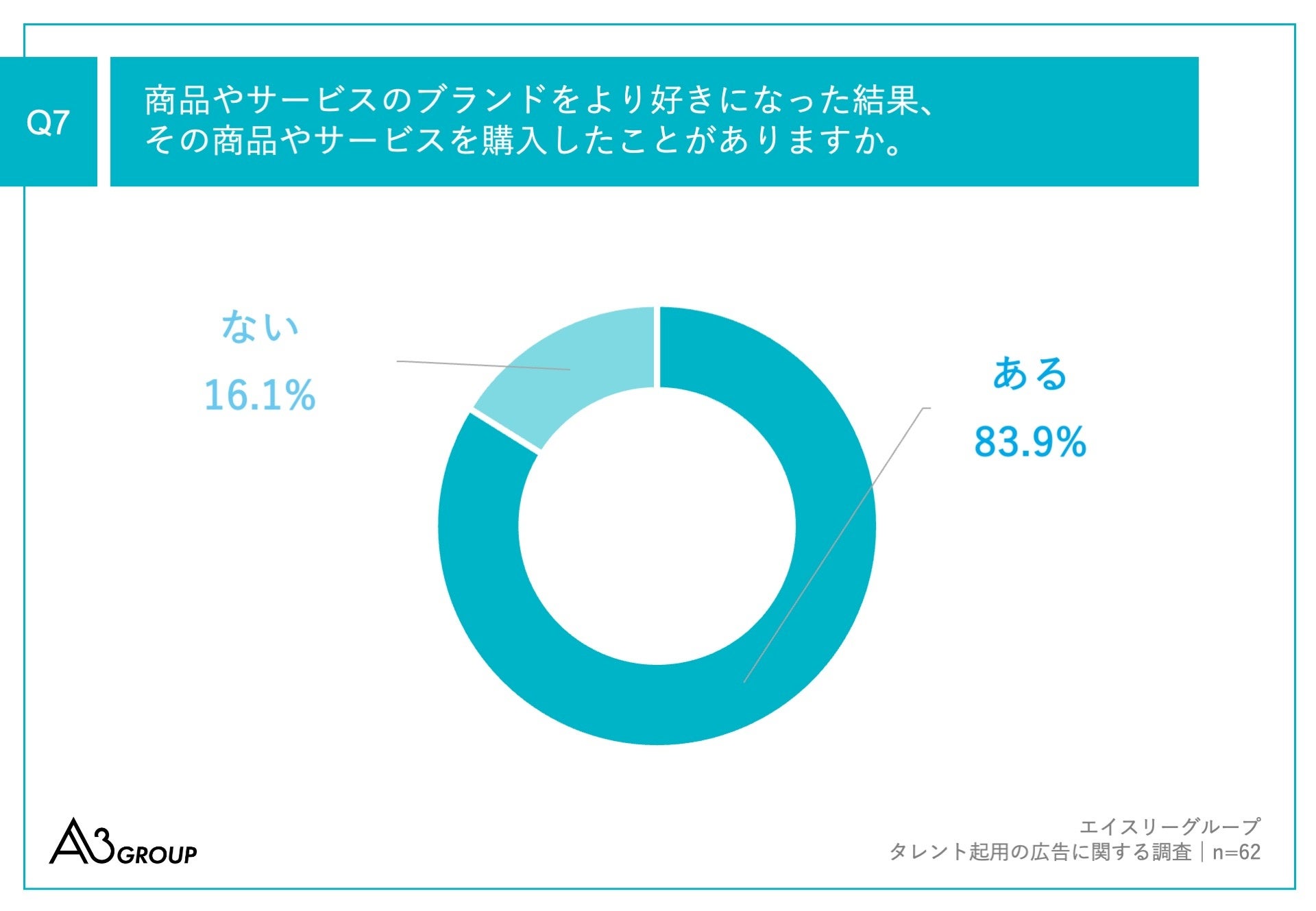 Q1で「よくある」「ややある」と回答した方に、「Q7.商品やサービスのブランドをより好きになった結果、その商品やサービスを購入したことがありますか。」(n=62)と質問したところ、「ある」が83.9%、「ない」が16.1%という回答となりました。
