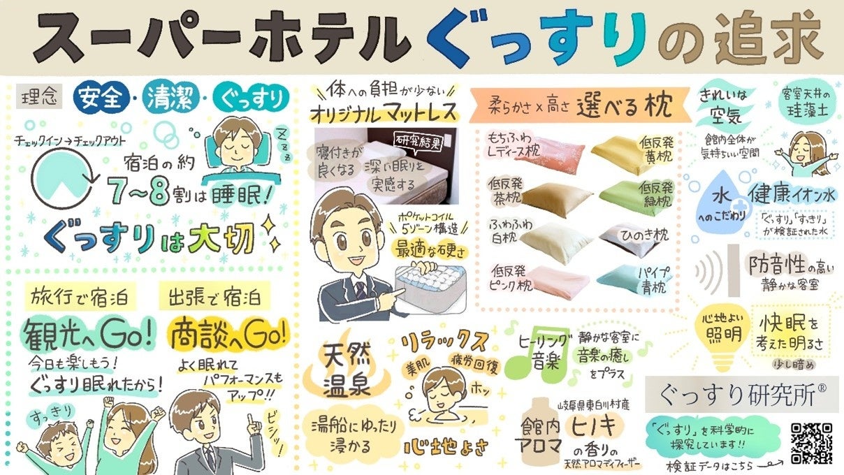 創業当初から、お客様が「ぐっすり眠れる」睡眠環境づくりにこだわってきたスーパーホテル。2004年より、大阪府立大学名誉教授・清水教永医学博士と共同で「ぐっすり研究所」を設立しました。