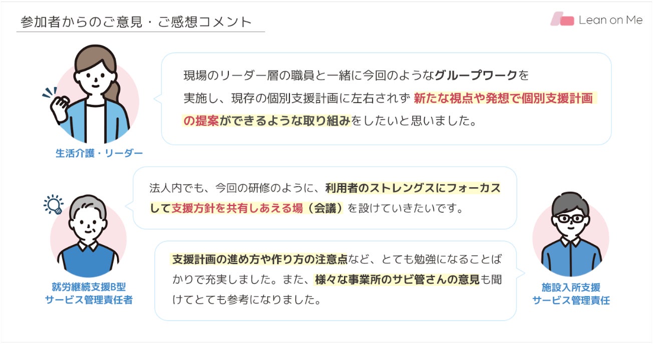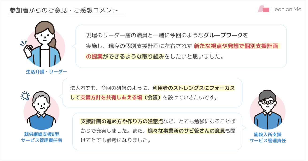 Lean on Meは、障がい福祉に特化したe-larningの提供や、現場の皆様の悩みをテーマとしたオンラインセミナーの開催に力を入れています。今後も、障がい福祉事業者の課題解決に向けて、最適なサポートを提供していきます。