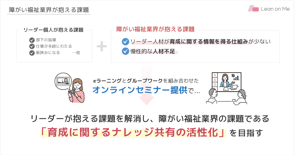 障がい福祉業界では、現場リーダーのチーム運営に関する悩みが絶えないといわれています。また、ノウハウやナレッジを持ち合わせている場合でも、事業所を越えて共有しあう仕組みがないことが指摘されています。株式会社Lean on Meでは、この課題を解消するために、障がい福祉施設向けにリーダー人材向けのオンラインセミナーおよびワークショップを実施しています。