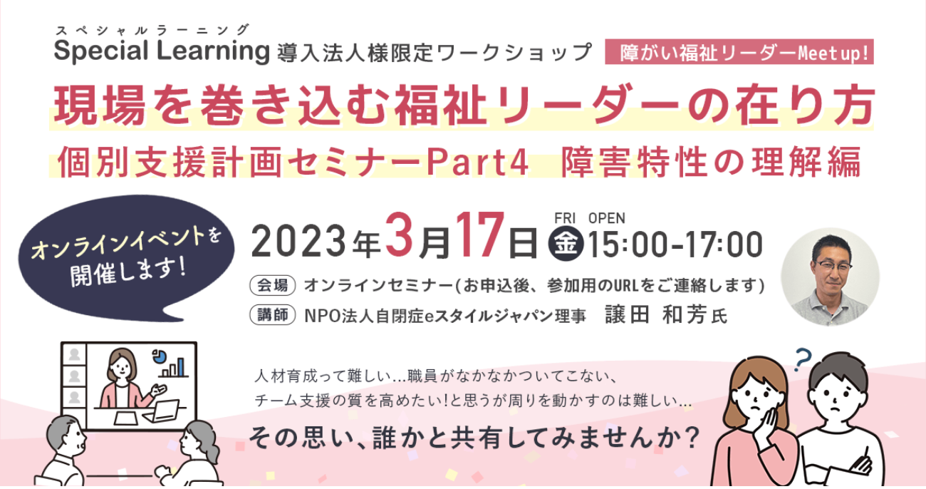 インクルTech* (インクルテック)で社会課題を解決する株式会社Lean on Me(本社:大阪府高槻市、代表取締役:志村駿介、以下「Lean on Me」)は、障がい福祉サービス従事者や、障がい者を雇用している企業を対象に提供している、障がい福祉特化型eラーニング「Special Learning」において、ユーザー限定の「リーダー人材向け」オンラインセミナー開催をお知らせいたします。