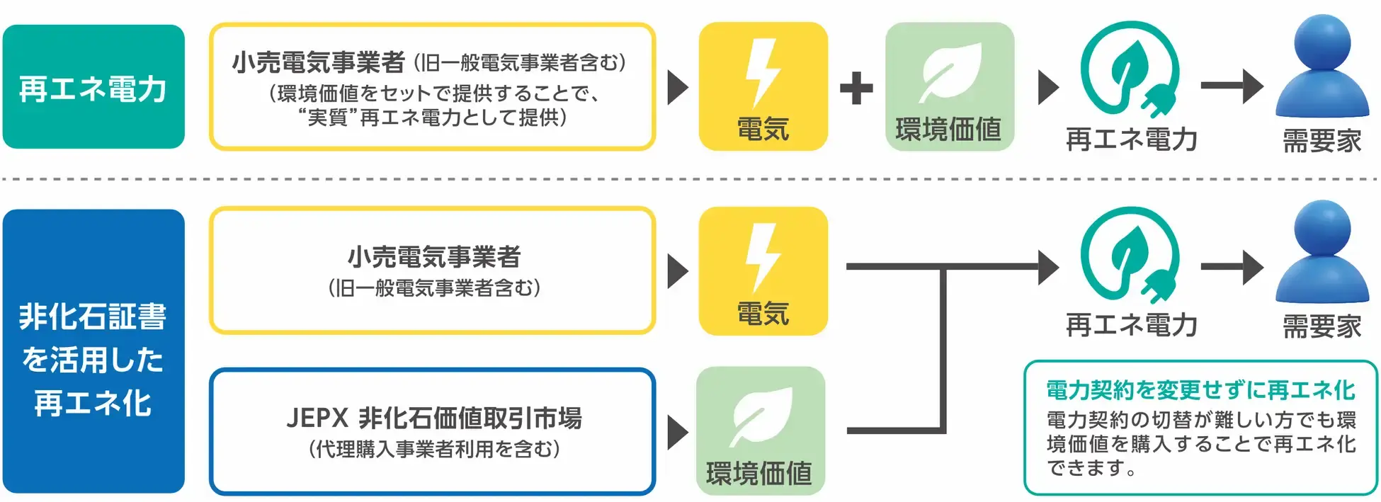 再エネ電力の導入方法として、従来は環境価値がセットとなった“実質”再エネ電力の導入が一般的でしたが、2021年11月よりFIT非化石証書が小売電気事業者以外もJEPXを通じて取得できるような制度に改正されたことで、需要家は電気と環境価値を個別に調達できるようになりました。
