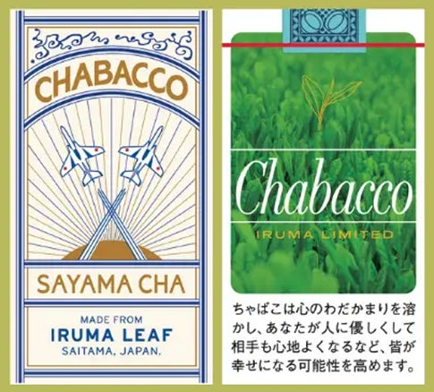 タバコサイズの箱にタバコを模したスティックタイプの粉末茶。入間市版Chabaccoにはブルーインパルスなどがデザインされています。