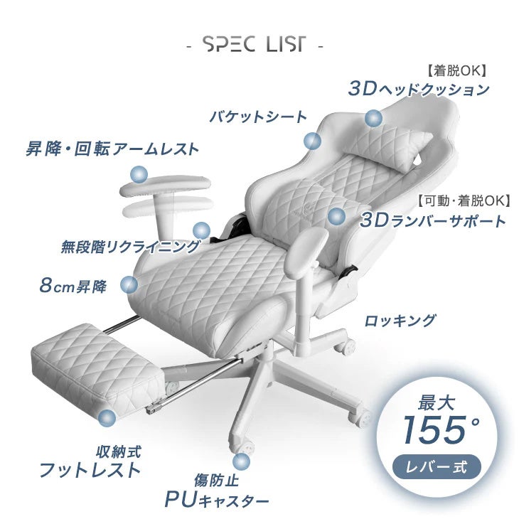 オールホワイトゲーミングチェアの詳細については以下になります。