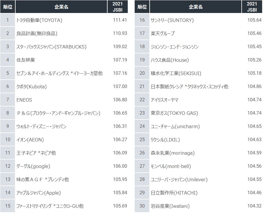 簡易版レポートでは、今回の調査対象企業300社から、TOP100と19業種別の上位ランキングを公開いたしました。総合1位は「トヨタ自動車」、2位「良品計画(無印良品)」、3位「スターバックス」。業種別傾向は、「薬品・医療用品」「エネルギー」「化粧品・トイレタリー」が高評価。