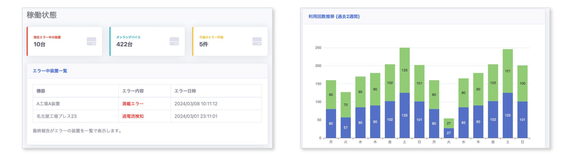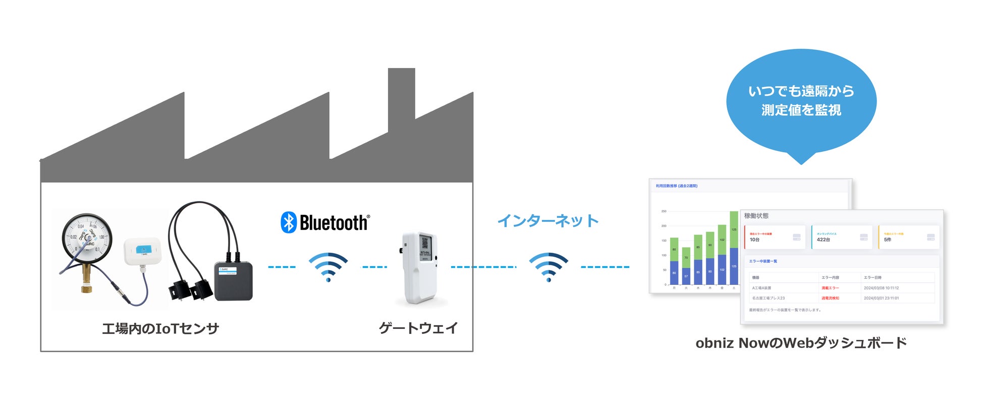 obniz Nowは、obnizのスマートデバイスを後付けするだけで始められる、機器のIoT化ソリューションです。機器の作動履歴やエラー状態などを、いつでもどこからでもWebダッシュボードで把握できるようになり、スマートな保守を実現します。