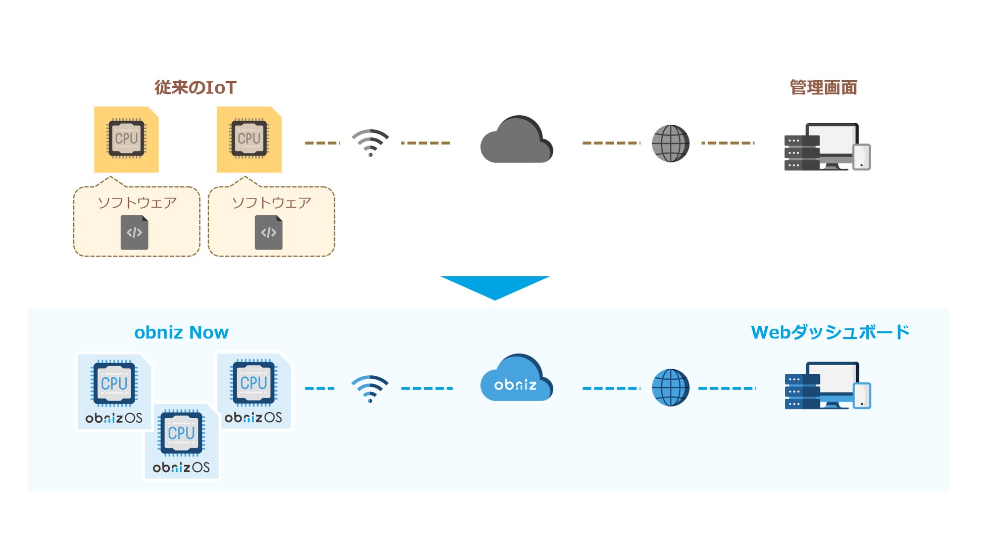 従来のIoTソリューションは端末のソフト開発が必要で、これが導入費用と運用費用を増大させる最も大きな要因となっていました。一方で、obniz Nowは通信デバイス・ネットワーク・クラウド・データ解析のすべてを、端末のソフト開発無しで提供します。これは、obniz Nowだけが実現できる特許技術。全ての企業様に同じソフトウェアを提供することで、圧倒的な低コストと短期導入を可能にしています。