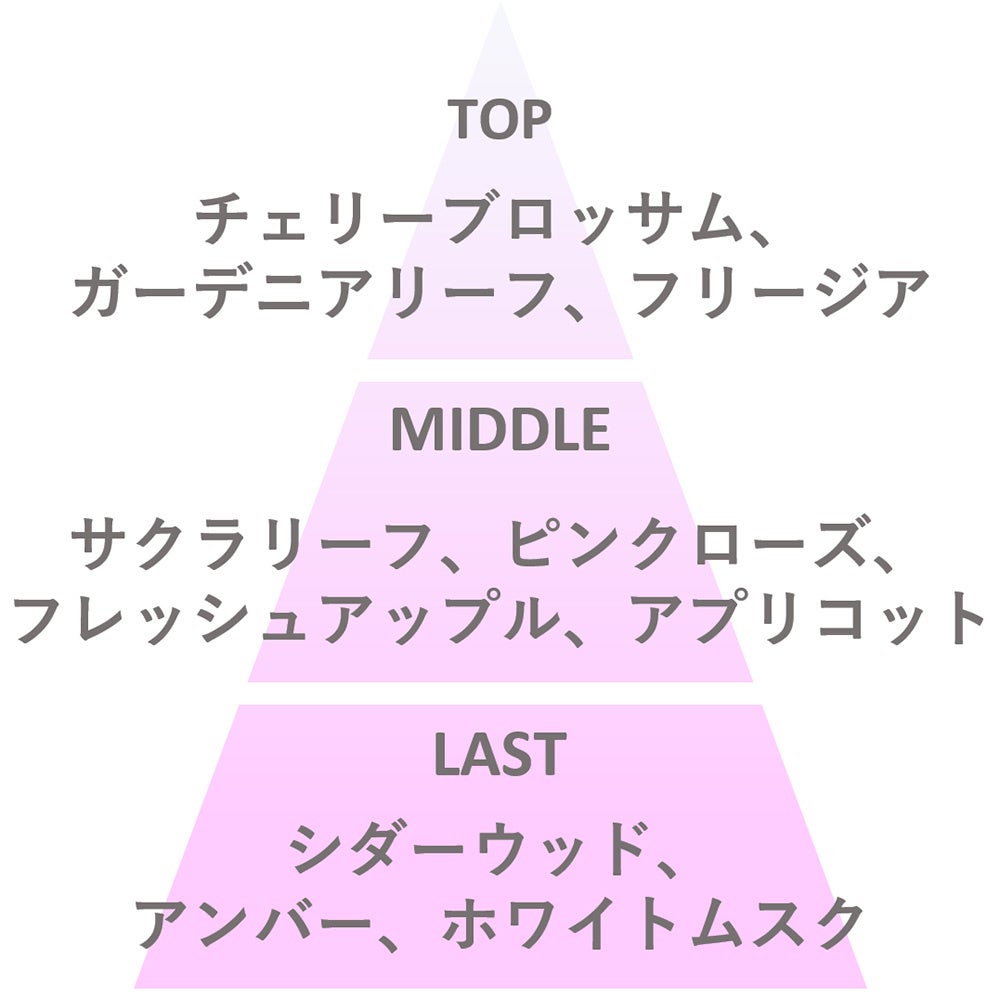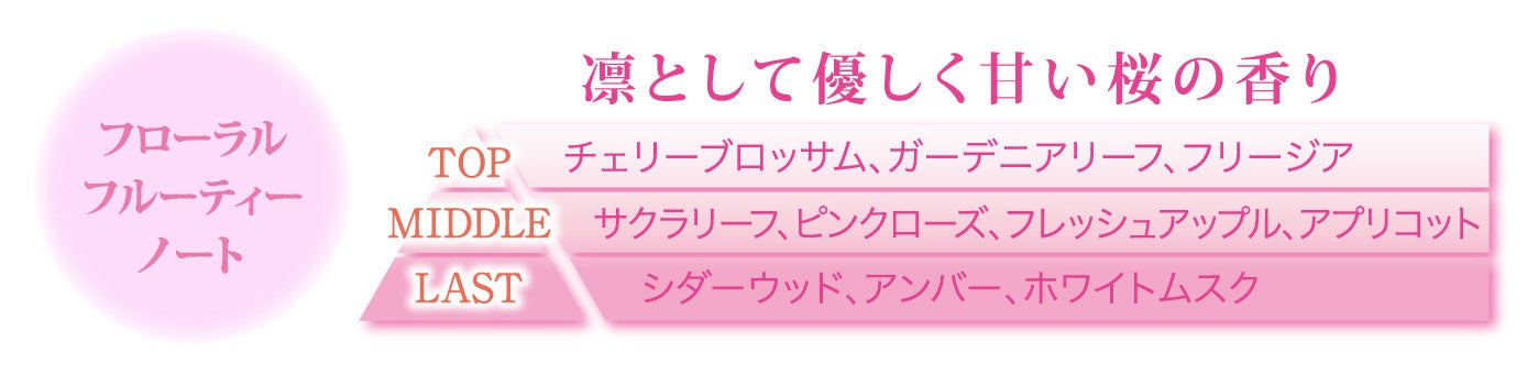 満開の桜に包まれるような上品で華やかな香り。優しさと自分の想いを見失わない芯の強さを持ちあわせた「大和撫子」を表現してきたサムライウーマンならではの、甘さの中にも爽やかさや落ち着きを感じる和のニュアンスを含んだフレグランスです。満開の桜の中にそよ風を感じるような、すっきりとした甘さが好印象を与えます。