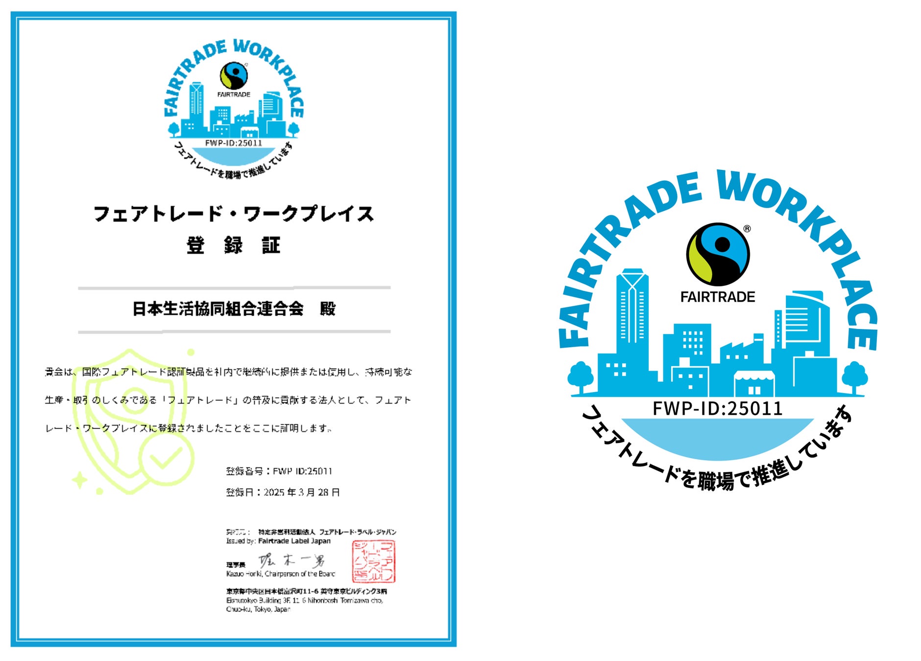 日本生活協同組合連合会(略称:日本生協連、代表理事会長:土屋敏夫)は、公正な貿易(フェアトレード)によって貧困の撲滅や、生産者の持続的な生活の実現を目指す特定非営利活動法人フェアトレード・ラベル・ジャパン(以下、フェアトレード ジャパン)の「フェアトレード・ワークプレイス登録制度」で、2025年4月「フェアトレード・ワークプレイス」に登録されました。