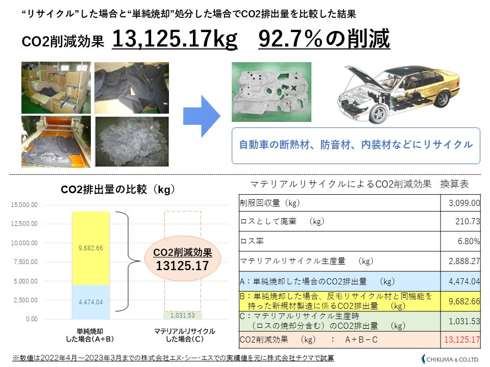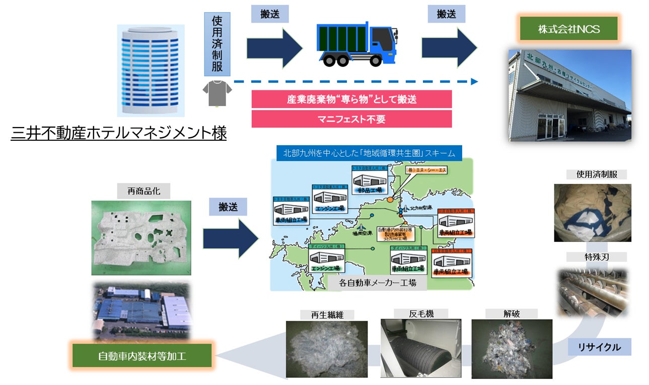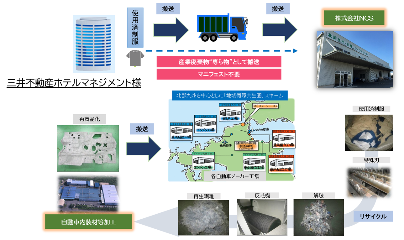 株式会社チクマ(本社:大阪市中央区、代表取締役社長 堀松 渉)は、株式会社三井不動産ホテルマネジメント(本社:東京都中央区)と連携し、同社が運営する「ザ セレスティンホテルズ」「三井ガーデンホテルズ」における2023年12月から新制服の導入に伴い、使われなくなった旧デザインの制服(約10,000着)を「廃棄物(ゴミ)」として扱うのではなく、チクマの持つリサイクルシステムを使い、すべて自動車内装材としてリサイクルすることができました。
