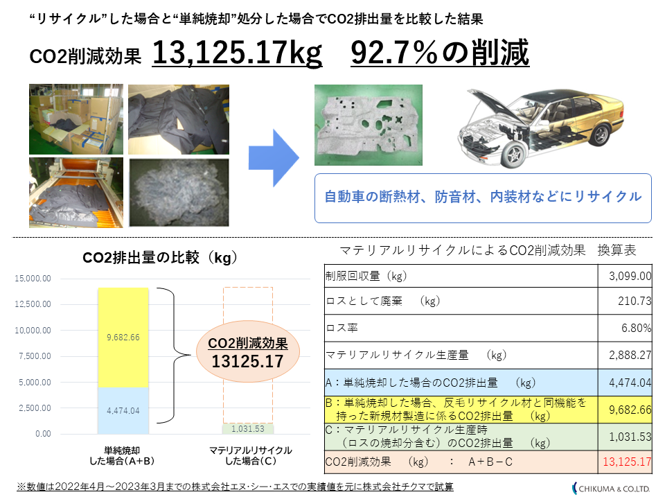 この取り組みによるCO2の排出削減量は、約13,125Kg、ゴミとして焼却する場合と比べ92.7%の削減となります。再資源化を行うことで、廃棄物の削減に加えて廃棄段階でのCO2排出も抑制できるため、環境負荷低減とともにSDGsの達成にも寄与することができます。