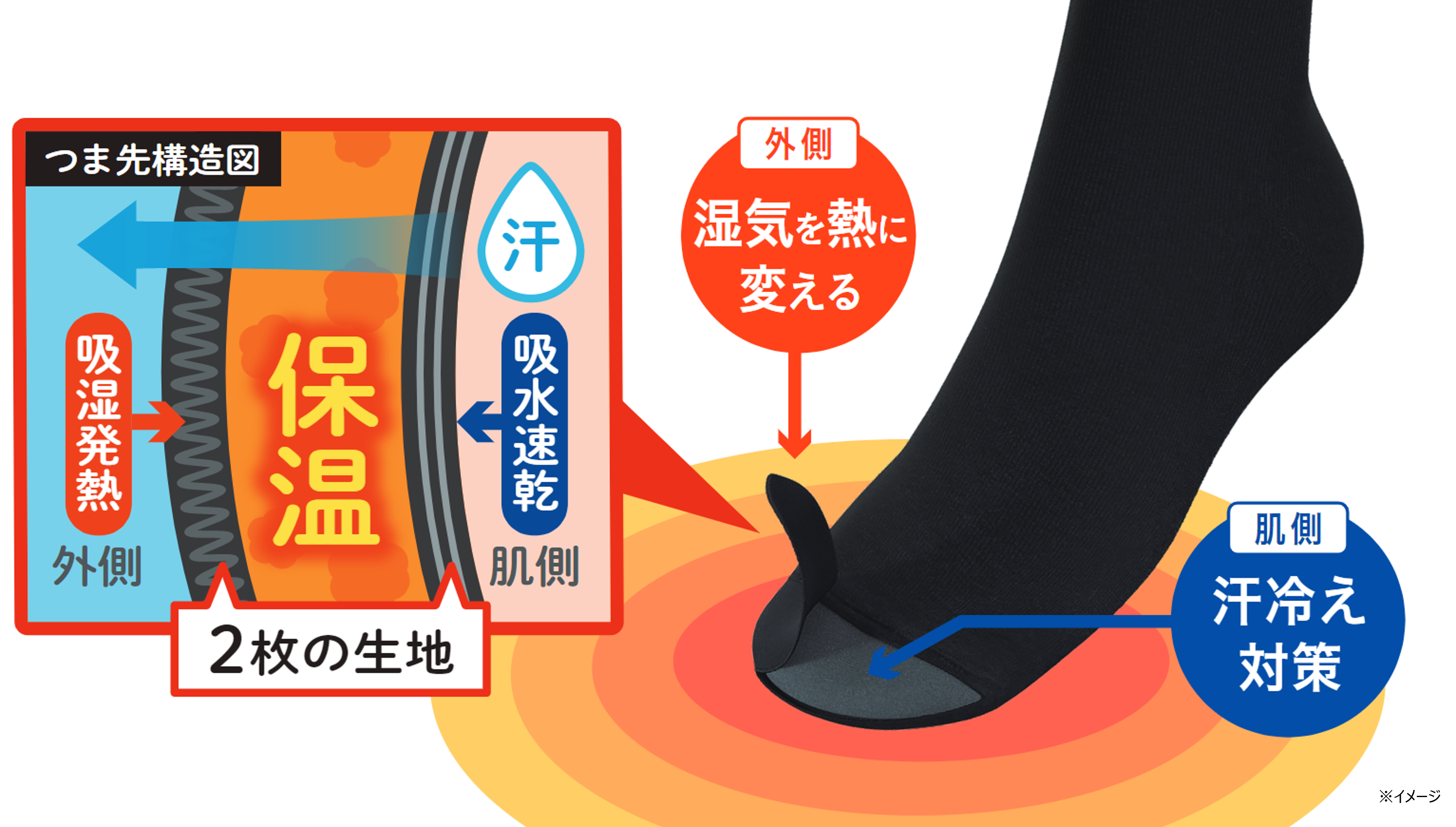 そんな「ココピタ」から、この秋冬シーズンに待望のソックスタイプも新登場※4。『ココピタプラス あったか実感』は秋冬の足もとのお悩みで多い“冷え”対策におすすめの商品です。弊社調査※5によると、寒い時期に冷えを感じる部分の第1位は「つま先(足指)」という結果でした。 そこで、お悩み解決ブランドとして「ココピタ」が提案するのが、冷えの気になるつま先が2層構造になった『ココピタプラス あったか実感』です。※4…かかとに「コの字型ストッパー」がついているのは、見せないスニーカー丈のみです。※5・・・2021年7月岡本調べ (2022年6月 ココピタ22SSトラッキング調査(男女20-49歳 N=1,689)