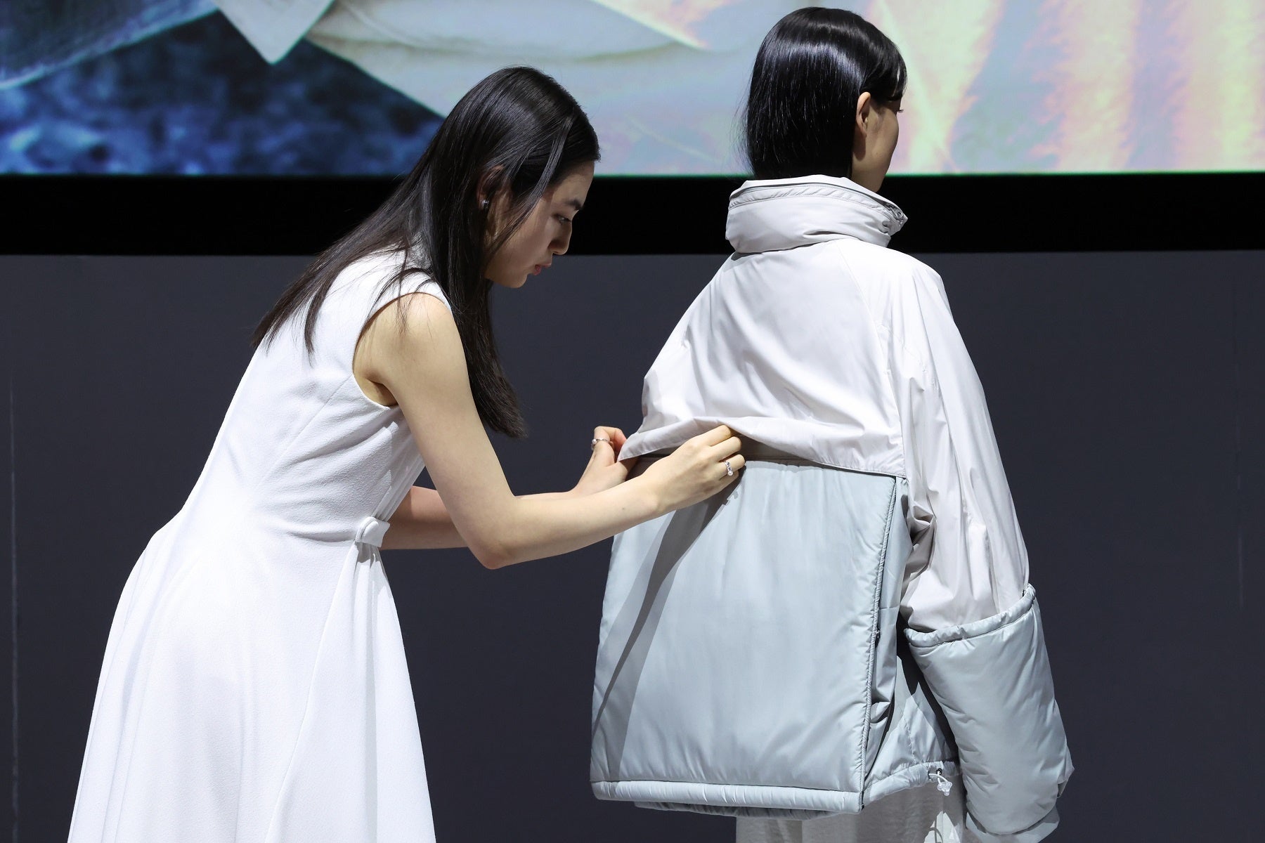 会の終盤には、「GOOD CAMPUS LIFE Project」のVol.1として、「がんばる大学生」を”ファッション”という身近な接点からサポートしようとする思いから生まれた「CAMPUS WEAR」がお披露目されました。この「CAMPUS WEAR」は、国内最古のファッションサークルであり、数々のデザイナーを輩出してきた早稲田大学 繊維研究会と共同開発したもので、大学生のがんばる時間を快適にするための工夫が随所に施されています。