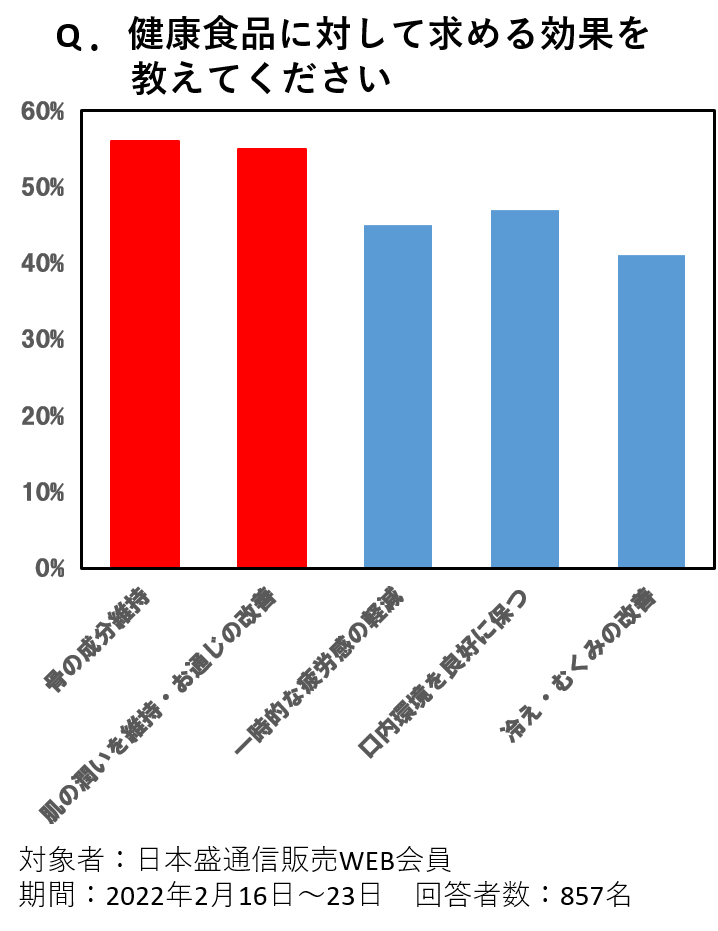 本商品は、当社の通信販売をご利用いただいているお客様のアンケートの声から生まれた商品です。表の通り、健康食品に対して求める効果として「骨の成分維持」と「肌の潤いを維持・お通じの改善」に効果を求めているお客様が多いことが分かりました。本アンケート結果を基に、“骨活”と“腸活”ができるような機能性表示食品を開発する運びとなりました。