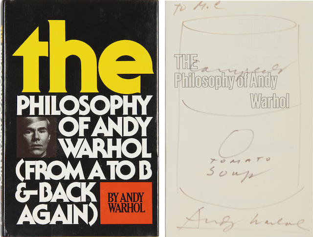 1975年に出版されたオリジナルのジャケットカバー付きの貴重で文化的意味のあるウォーホルの歴史的な「初版本」。 タイトルページには1975年9月から米国9都市とヨーロッパで宣伝ツアーをした際にウォーホル自身によってフェルトペンで描かれたトマトスープ缶のドローイング、直筆サイン、署名がされている。 ハーコート・ブレイス・ジョバノビッチが出版。