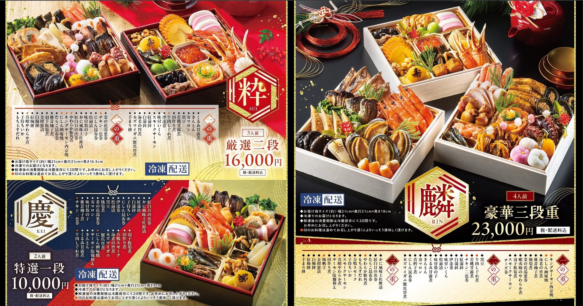 2025年も厳選素材を使用、例年ご好評の豪華三段重「麟(りん)」23,000円をはじめ、厳選二段「粋(すい)」16,000円、特選一段「慶(けい)」10,000円の計3種類をご用意いたしました。