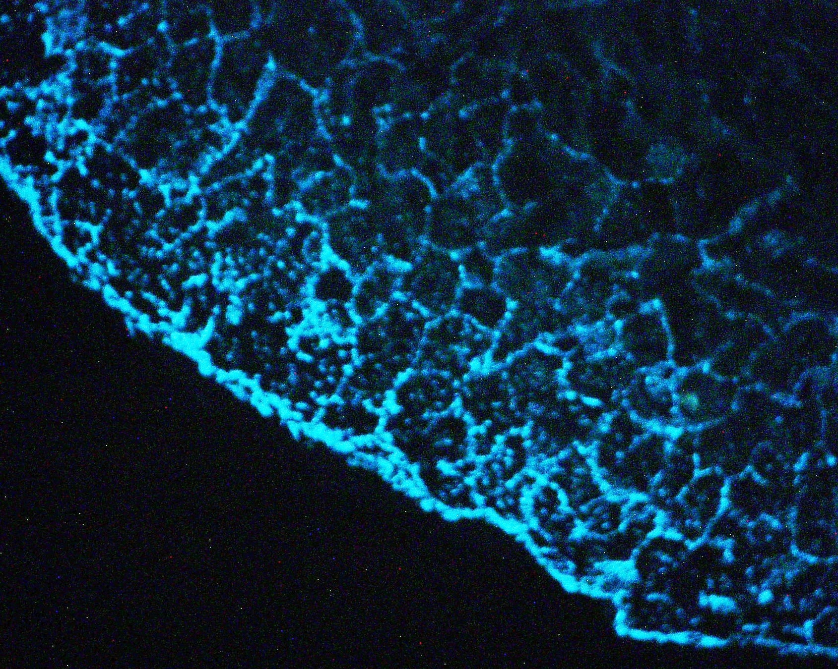 炊飯時に「にがり」を加えることで、主成分のマグネシウムが米の細胞壁に結合し、炊飯中に細胞が壊れるのを防ぎます。蛍光顕微鏡で観察した結果、「にがり」を加えたごはんではマグネシウムイオン(青色)が米の細胞壁に付着し、細胞が壊れるのを防いでいることが確認されました。