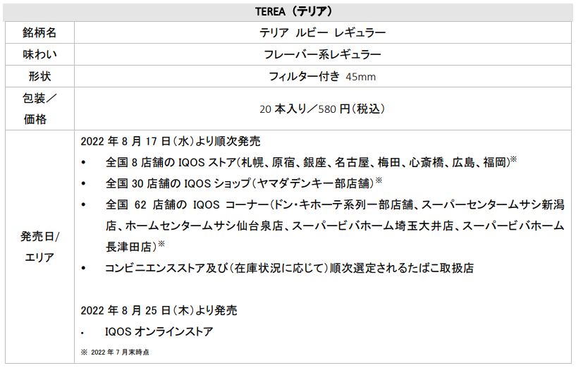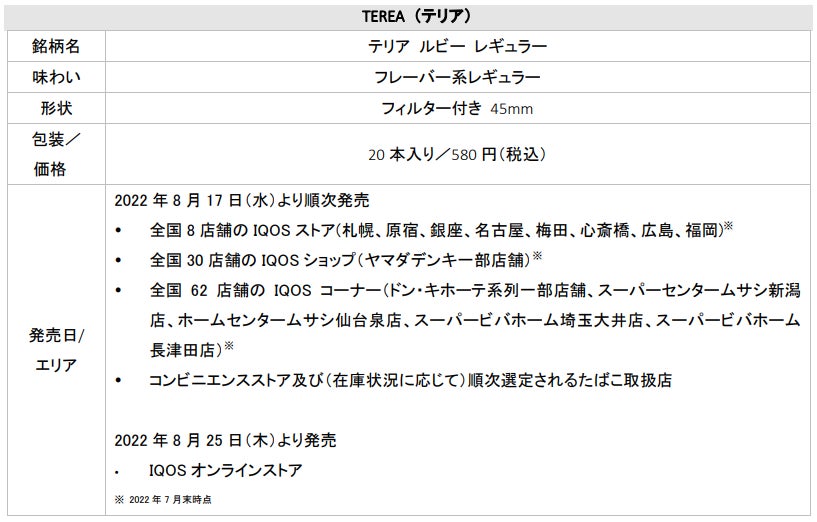 フィリップ モリス ジャパン合同会社(本社:東京都千代田区、社長:シェリー・ゴー、以下「PMJ」)は、加熱式たばこIQOS ILUMA(イルマ)専用たばこスティックのテリアから、新たに「テリア ルビー レギュラー」を、2022年8月17日(水)より全国8店舗のIQOSストア※、IQOSショップ(ヤマダデンキ一部店舗)※、IQOSコーナー(ドン・キホーテ系列一部店舗他)※、コンビニエンスストア及び(在庫状況に応じて)順次選定されるたばこ取扱店で、2022年8月25日(木)よりIQOSオンラインストアにて順次発売を開始いたします。