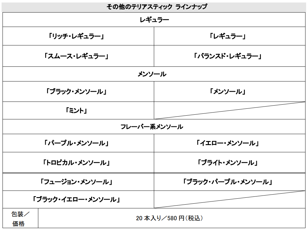 今回の「テリア ルビー レギュラー」の発売により、テリアスティックのラインアップは全15種となったほか、既存の「レギュラー」、「メンソール」、「フレーバー系メンソール」カテゴリーに加え、新たに「フレーバー系レギュラー」が追加となりました。
