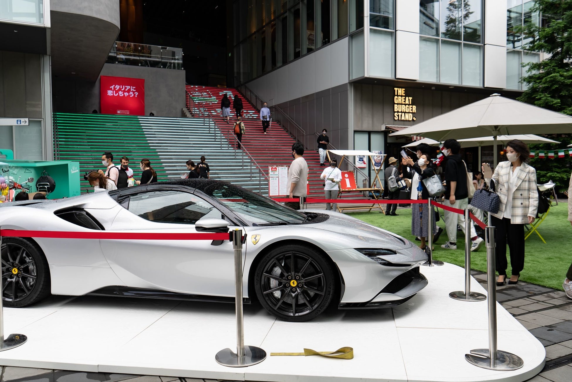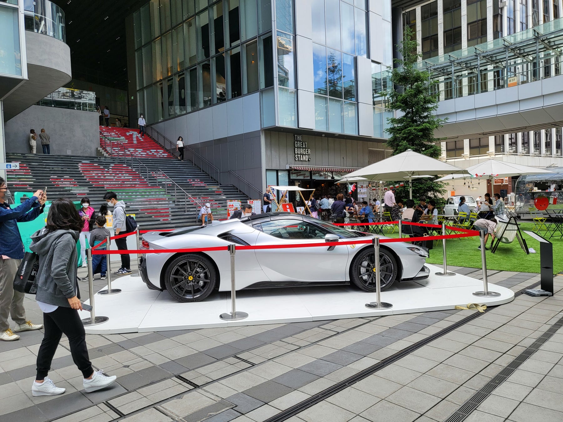 渋谷ストリーム前 稲荷橋広場には、イタリアを代表するラグジュアリーカー、フェラーリが圧倒的な存在感を放ち、多くのご来場者の心を引き寄せていました。今回は、上品な格式の高いエレガントなシルバーグレーのフェラーリの最新モデルSF90スパイダーを展示しました。