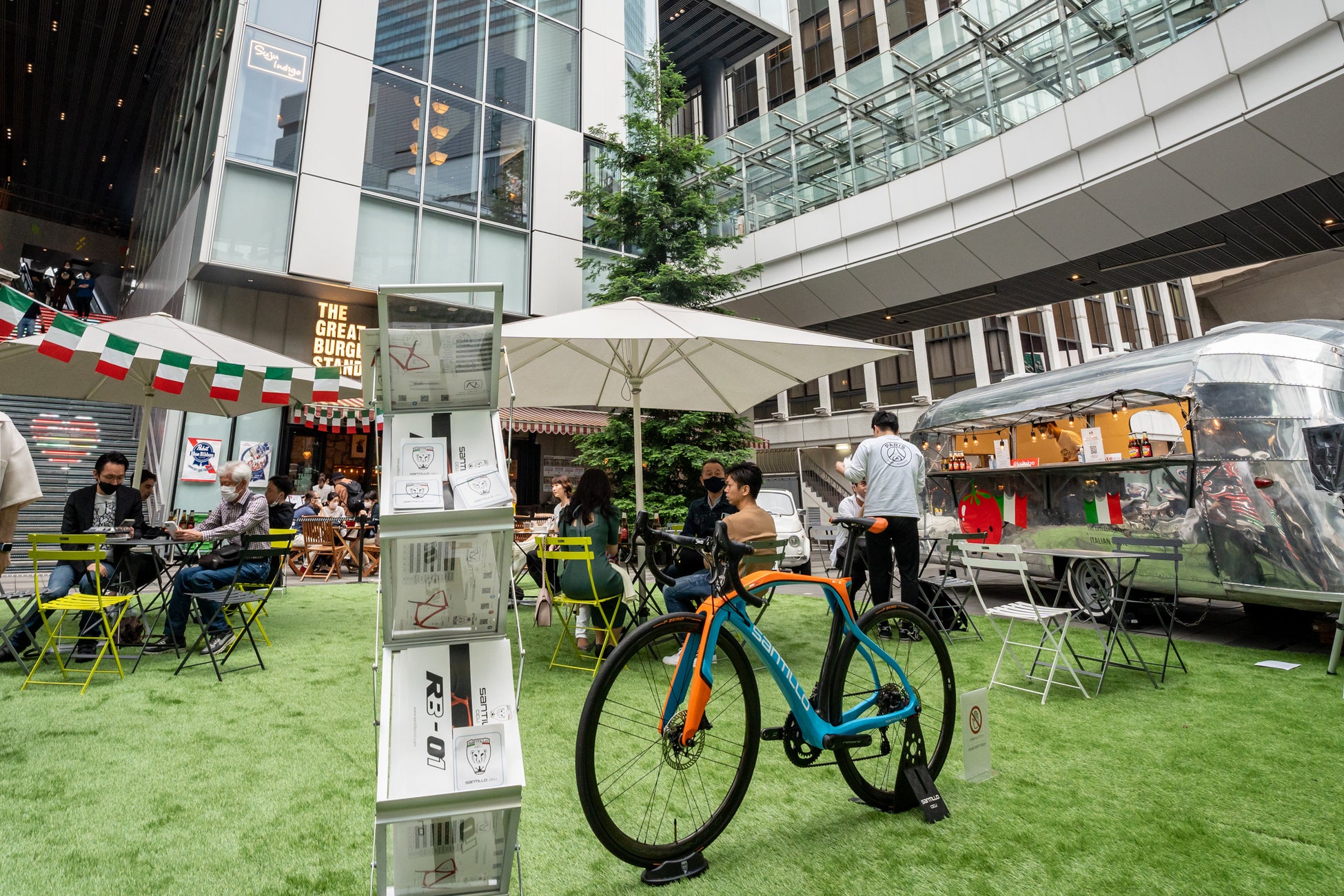 True Italian Gardenのキッチンカーの横には、一台、150万円もの高級イタリアモーターサイクル・SANTILLO CICLIを展示しました。SANTILLO CICLIは、イタリア・ローマ生まれのデザイナー、サンティッロ フランチェスコが神奈川県鎌倉市で創設したロードバイクブランド。フォークの先端からリアエンドまで、どの角度から見ても「非常にユニーク」な曲線形状が美しく繋がり、それでいて絶妙なバランス感覚の上で見事に全体がまとまっています。この形状は、「獲物を狙うチーターが、引き締まった四肢で躍動的に大地を駆ける姿」をモチーフとしています。