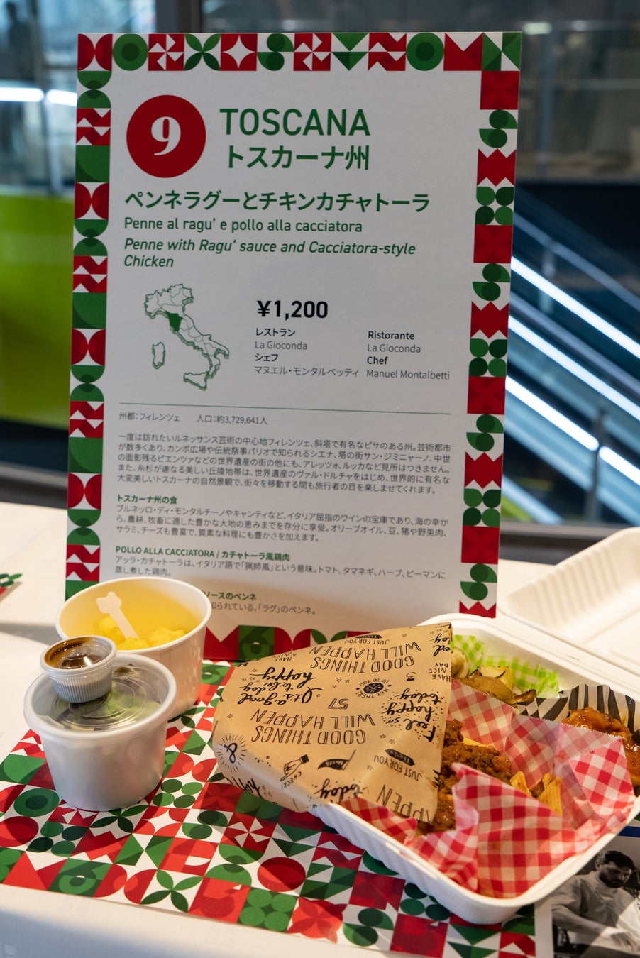 渋谷ストリーム ホール 4Fには、イベントの目玉のひとつイタリア・グルメギャラリーを設けました。在日イタリア商工会議所のA.Q.I.(※AQI=正式名称(Adesivo di Qualità Italiana)とは在日イタリア商工会議所が認定している。イタリア料理の伝統的なレシピを遵守し、イタリアの文化とホスピタリティーをお客様にお伝えいるレストランのこと)。A.Q.I.認定レストランより選りすぐりのトップ20のレストランが参加。イタリアンのトップシェフたちがイタリア全土20州の郷土料理をテーマに作ったイタリアスタイルのOBENTO(お弁当)を販売しました。