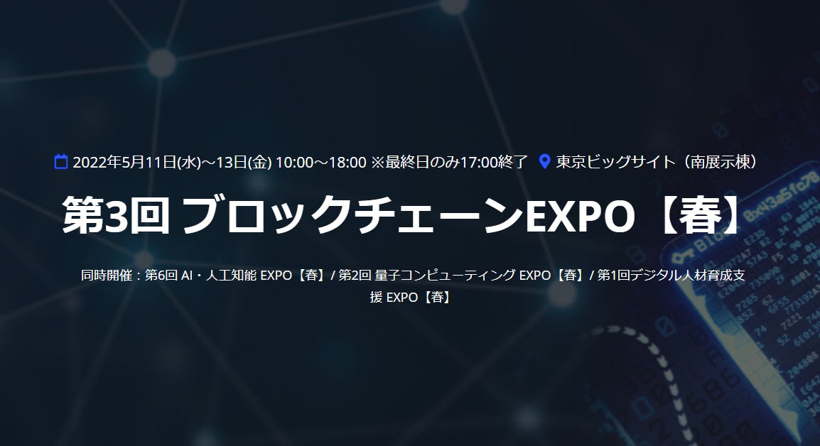 弊社は、2022年5月11日(水)~ 5月13日(金)の3日間にわたり東京ビッグサイトにて開催される国内最大級のブロックチェーン専門展「第3回ブロックチェーン EXPO【春】」内の「NFTゾーン」へ出展することをお知らせいたします。