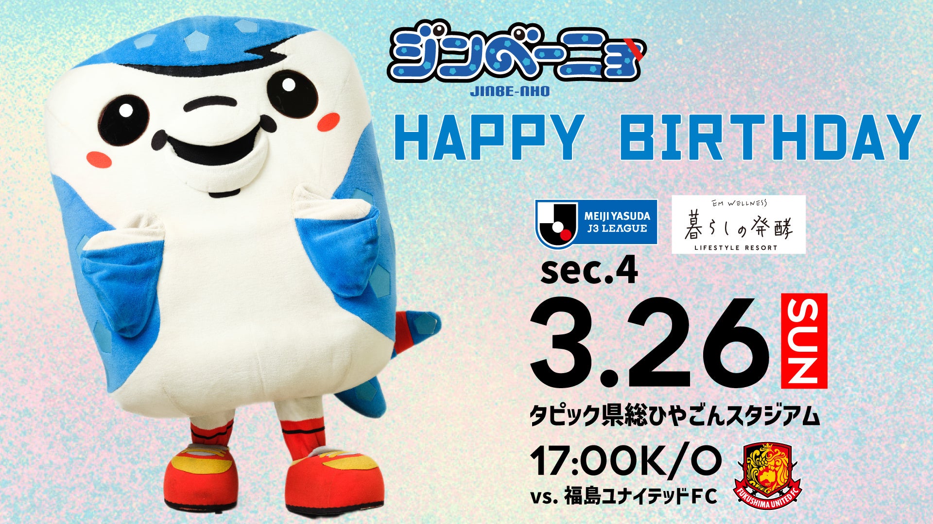 3月26日(日)に行われる2023明治安田生命J3リーグ第4節福島ユナイテッド戦(タピック県総ひやごんスタジアム/17:00キックオフ)は、3月18日(土)に誕生日を迎えたFC琉球公式マスコット「ジンベーニョ」の誕生日を祝福するためジンベーニョDAYとして開催いたします!