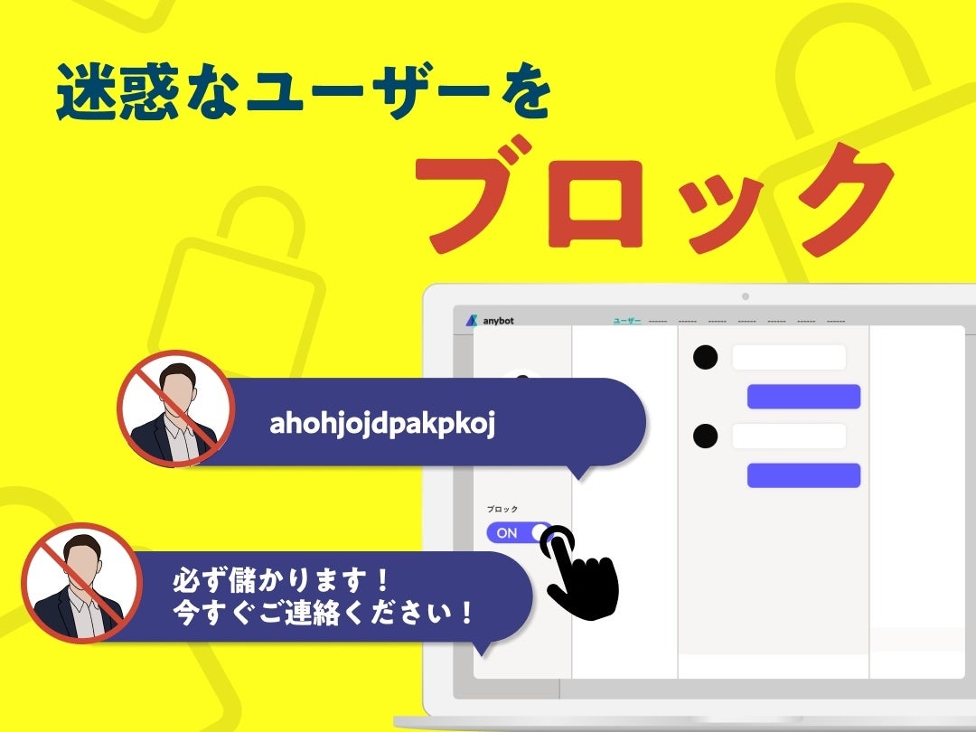 エボラニ株式会社が提供するLINEマーケティングツール「anybot」は2024年1月、無意味なメッセージや妨害などの行為をする迷惑ユーザーをブロックする機能を実装いたしました。円滑な業務の妨げを減らし、本当に必要な対応に専念していただけます。