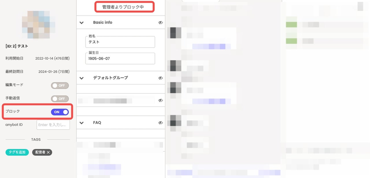 anybot管理画面>ユーザー画面のユーザー情報画面にて、「ブロック」をオンにする。