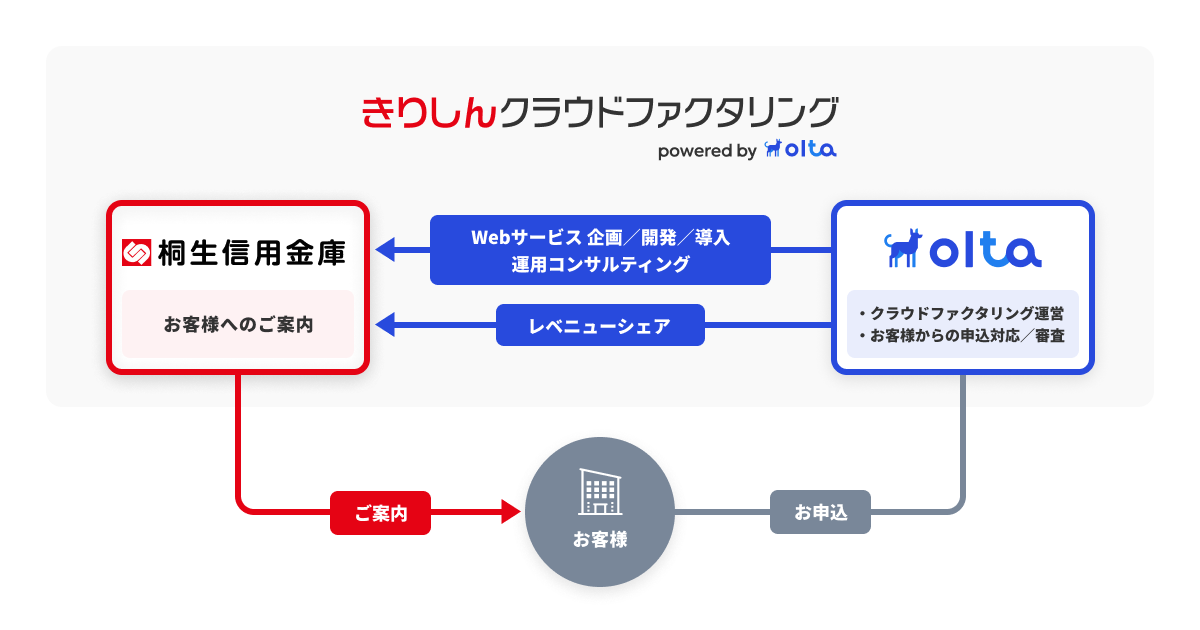 OLTAと桐生信用金庫とのクラウドファクタリング事業における提携では、OLTAがWebサービスの企画・開発・導入および運用におけるコンサルティングを桐生信用金庫に提供し、桐生信用金庫は自社ブランドの金融商品のサービスラインナップに加え、法人・個人事業主のお客様にご案内します。