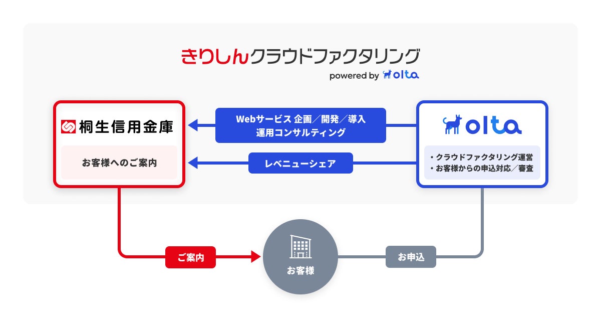日本初※のオンライン型ファクタリングサービス「OLTAクラウドファクタリング」を提供するOLTA(オルタ)株式会社(代表取締役社長兼CEO:澤岻 優紀、以下「OLTA」)は、桐生信用金庫(理事長:津久井 真澄)と共同でクラウドファクタリング事業「きりしんクラウドファクタリング powered by OLTA(https://www.kiryu-olta.jp)」を立ち上げ、2022年12月1日よりサービスの提供を開始します。